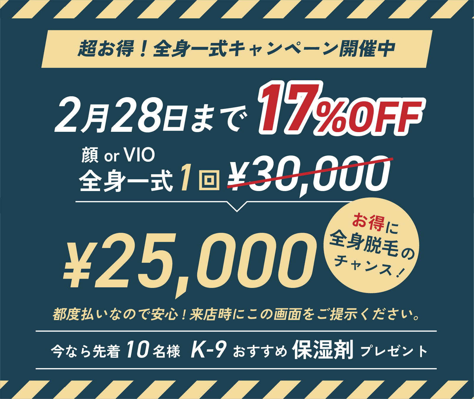 ヒゲ脱毛は、1回3,500円。全身一式( 顔 or VIO )は、30分5,000円でメンテナンスできます。